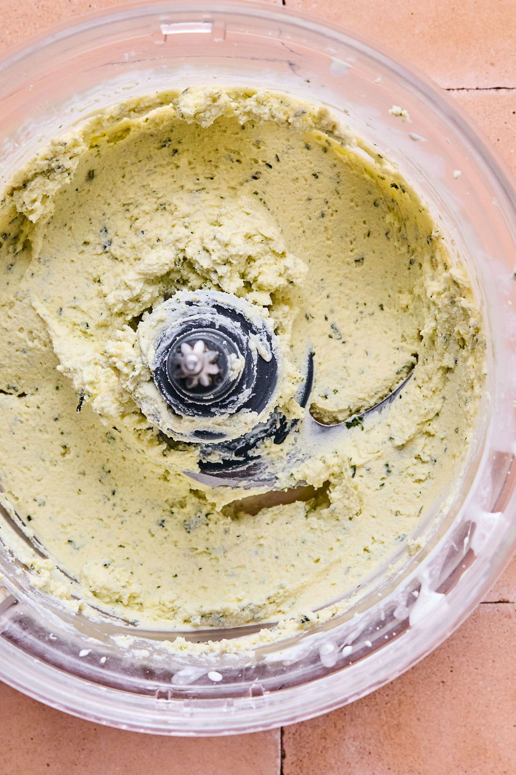 Adding a small amount of heavy cream and pulsing briefly in a food processor helps loosen the cheese without making it runny.