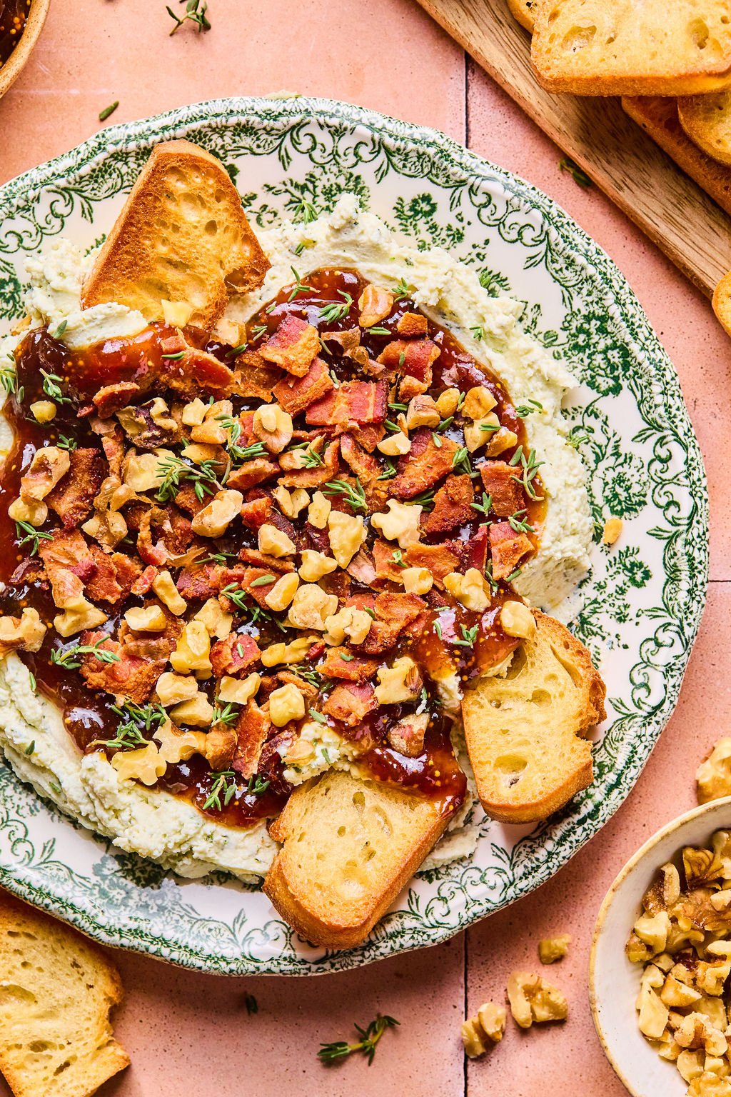 - Assemble the dip: Spread the softened Boursin mixture into a shallow serving dish. Spoon fig jam over the top. Sprinkle with chopped bacon and the toasted walnuts. Finish & serve: Garnish with fresh thyme and serve with crackers, crostini, or bagel crisp.