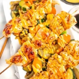 These Greek chicken kabobs are tender, juicy, and marinated in lemon, garlic, and herbs for all the Mediterranean flavor you crave. Paired with cool tzatziki sauce and fresh salad, this high-protein Mediterranean meal is a summer grilling recipe that your family will ask for again and again!