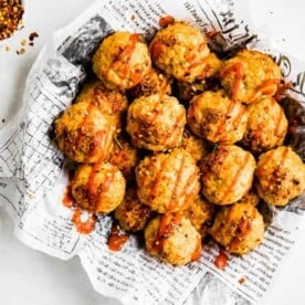These Sriracha Chicken Meatballs are super quick and can serve as an entree or appetizer. They are juicy and topped with red pepper flakes and drizzled with sriracha. Whole30, Keto,Paleo and Dairy Free.Â
