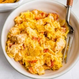 My new Whole30 Rotel Chicken Spaghetti Squash Casserole is filled with dairy free cream cheese, chicken, spaghetti squash, rotel, coconut milk, and nutritional yeast. It is creamy, filling and out of this world delicious. Keto, Paleo and Whole30 compliant.