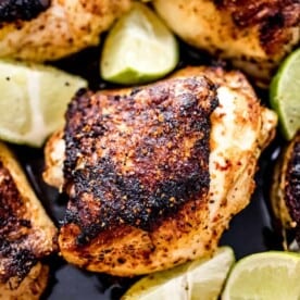 These Chili Lime Chicken Thighs are rubbed in lemon juice and covered with Tajin seasoning. Cooked in a cast iron skillet and finished in the oven for that gives the skin a nice crispy crunch. Keto, Whole30, and Paleo.