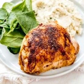 These Crackling Chicken Thighs Chicken are rubbed in homemade Cajun seasoning and cooked in a cast iron skillet and finished in the oven. These come out juicy and crispy every single time. Whole30, Keto, Paleo and Gluten Free.Â