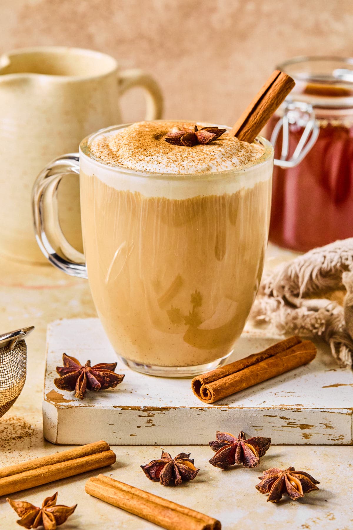 Step 1: Heat the chai concentrate and milk together until hot but not boiling. Froth or whisk until creamy, pour into a mug, then add the espresso. Spoon vanilla bean cold foam over the top and finish with a dusting of cinnamon and optional star anise or cinnamon stick.