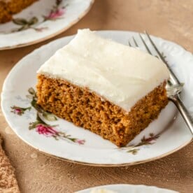 This Apple Cake with Brown Sugar Cream Cheese Frosting is extremely easy and quick to make. It requires boxed spice cake mix, apple pie filling, eggs, butter, cream cheese, vanilla extract, powdered sugar, brown sugar, maple syrup and cinnamon. It’s a real crowd pleaser, even for kids!