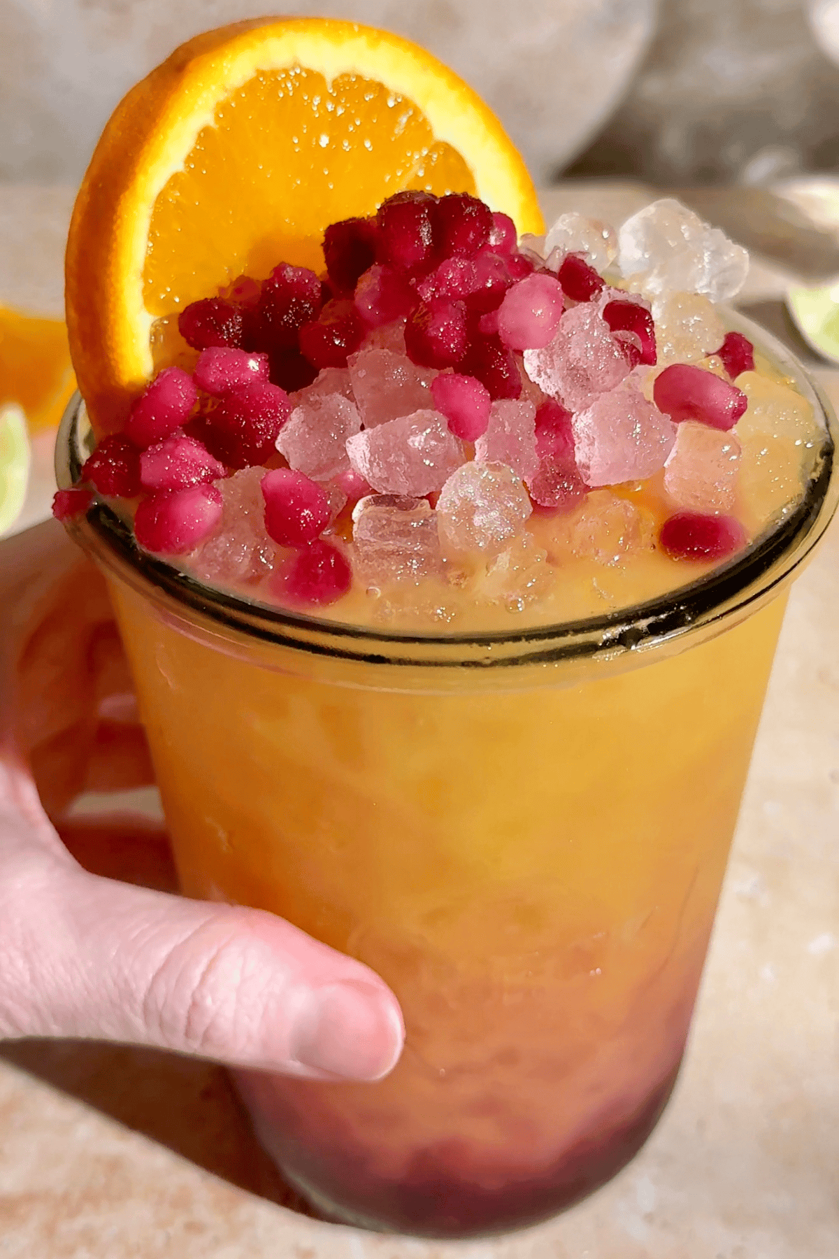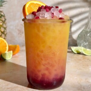 Step 2: Strain the pineapple mixture over the ice to create a layered drink, then garnish with frozen or fresh pomegranate arils and an orange wedge. Enjoy!