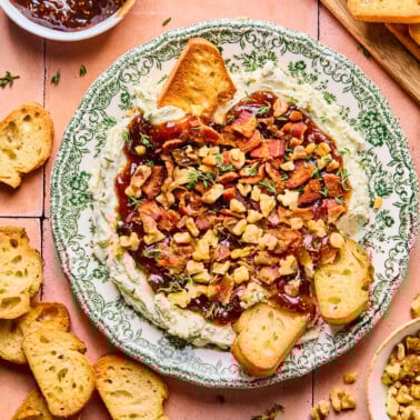 This Boursin dip comes together in minutes and disappears just as fast once it hits the table! Soft whipped garlic and herb cheese is spread into a shallow dish, then finished with fig jam, crispy bacon, and toasted walnuts for a sweet-and-savory bite that feels special without any extra effort. Aside from toasting the nuts, there’s no oven time involved, which makes this an easy win when you need a quick appetizer that still feels thoughtful.