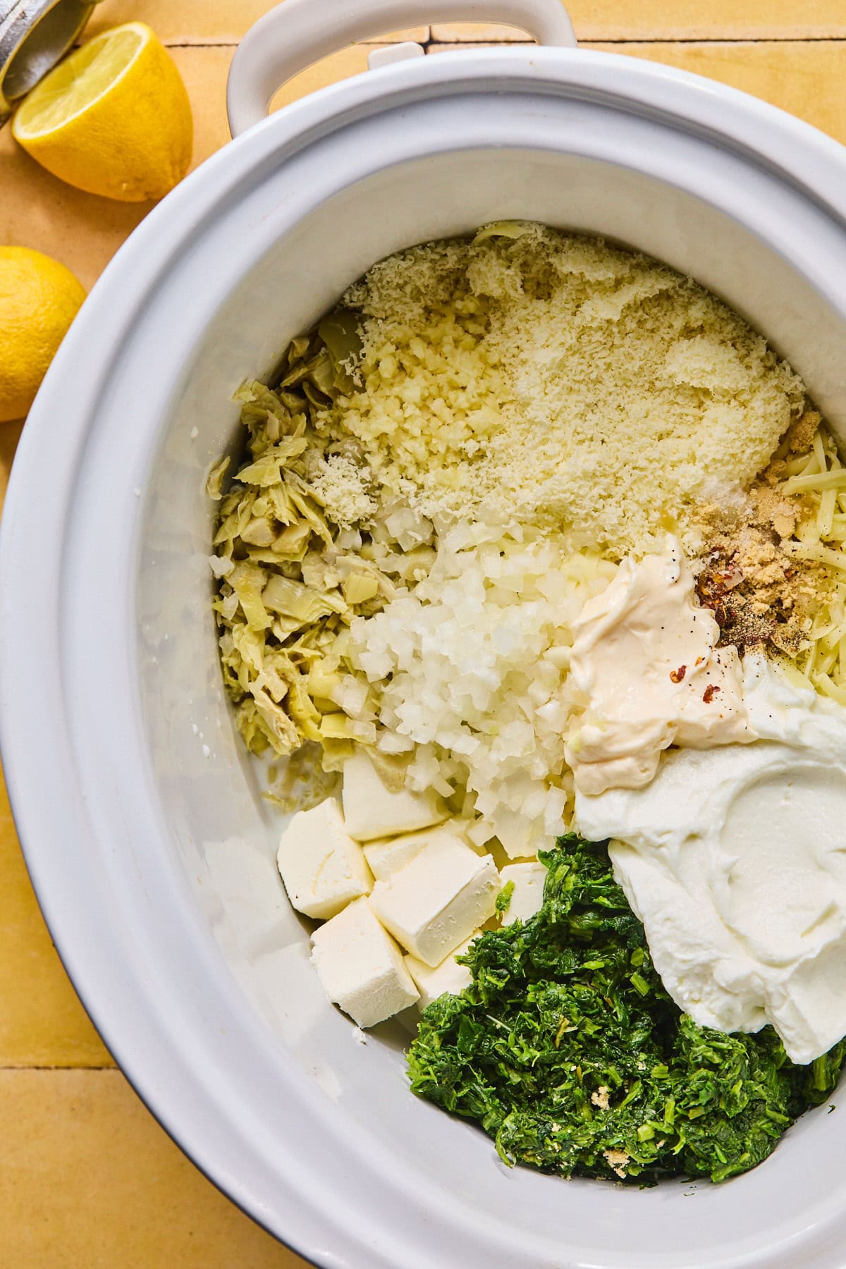 Step 1: Add the thawed and well-drained spinach, chopped artichokes, sweet onion, garlic, cream cheese, Greek yogurt, mayonnaise, mozzarella, Parmesan, milk, lemon juice, onion powder, salt, pepper, and crushed red pepper (if using) to the slow cooker. Stir everything together until well combined.