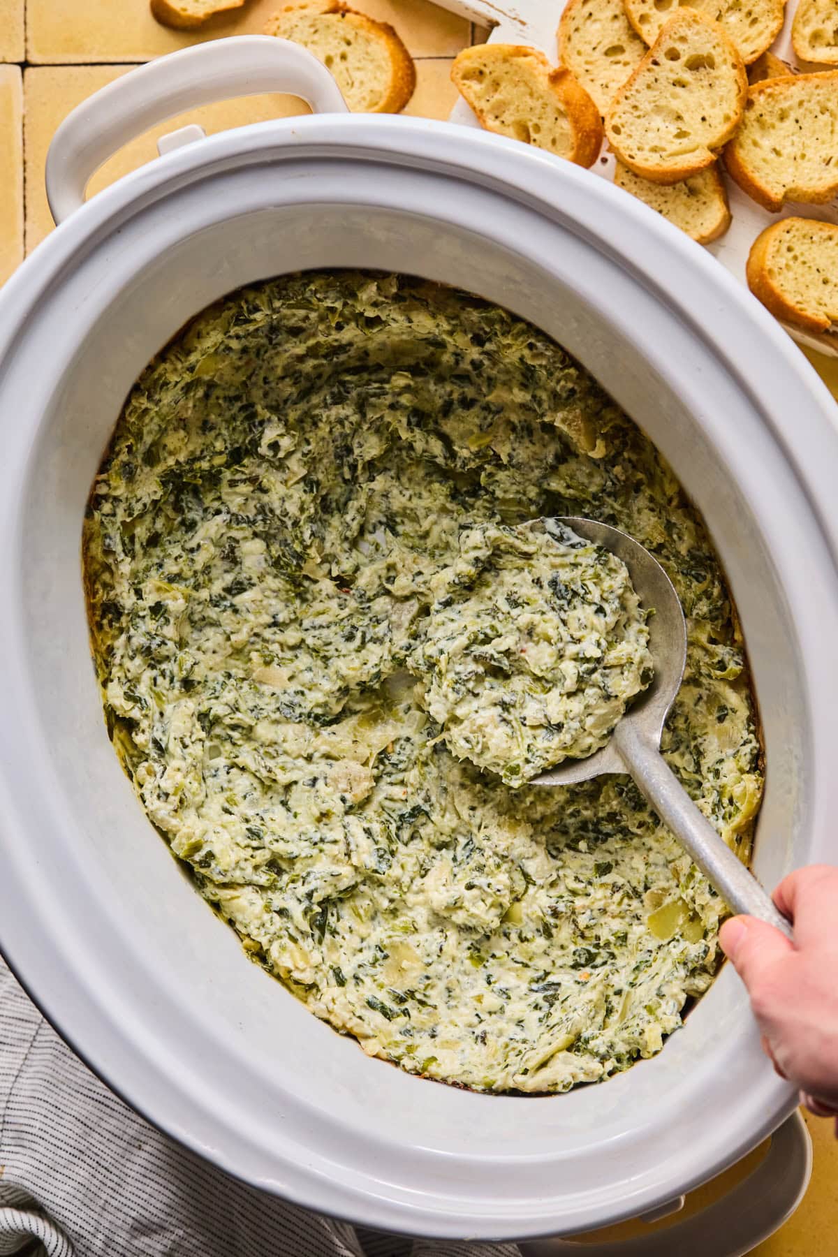 - Serve it warm right in the slow cooker. One of the best parts about this dip is that it stays hot and melty for hours, making it perfect for parties! Serve with toasted baguette slices, crackers, or tortilla chips.
