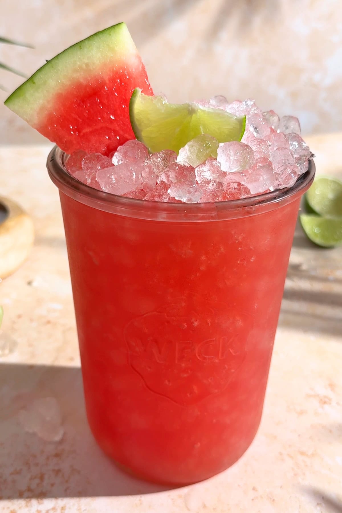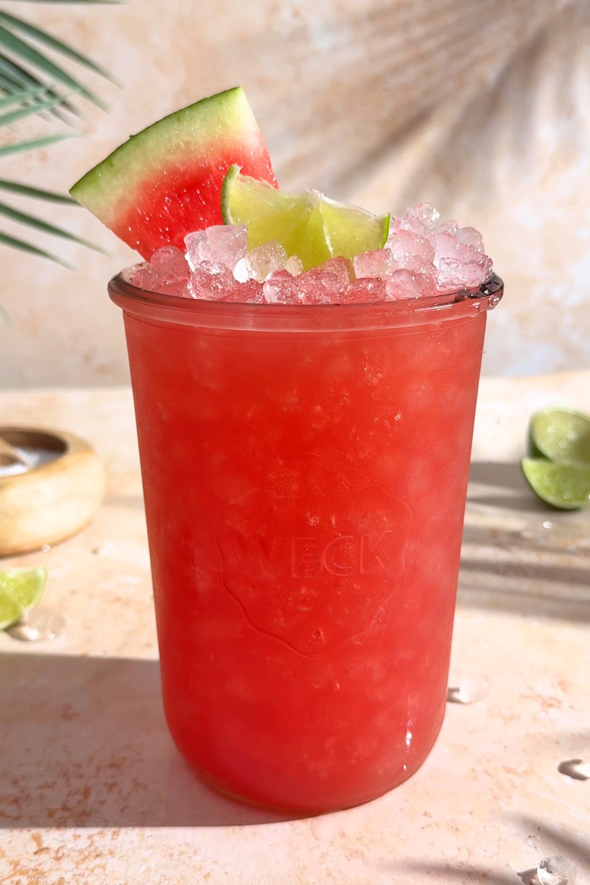 - Garnish with a lime wedge and a slice of watermelon. Enjoy!