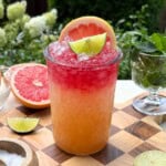 Slowly pour 1/3 cup of the cooled hibiscus tea as the top to layer. Garnish with a grapefruit wheel and lime wedge!